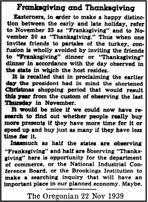 From the Centralia (Washington) Chronicle: Franksgiving Day is Nov. 23 – Thanksgiving day will remain the last Thursday in November.16