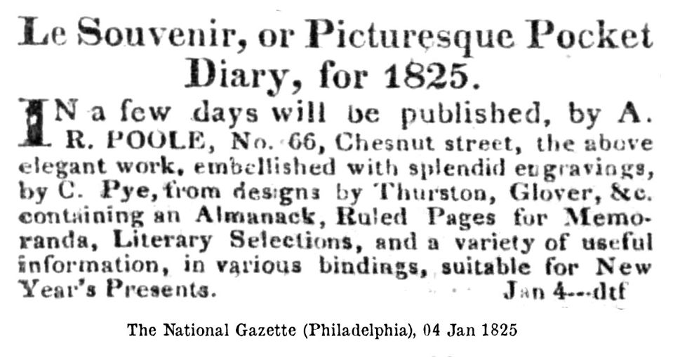 While prior to the 1800s diaries and journals were more often utilized by men, as the price of paper decreased and literacy rates rose, women also began to keep diaries and journals. American stationers began publishing their own version of annual diaries. An advertisement for a “picturesque pocket diary” appeared in a Philadelphia newspaper in early 1825, promoted as a suitable New Year’s present.