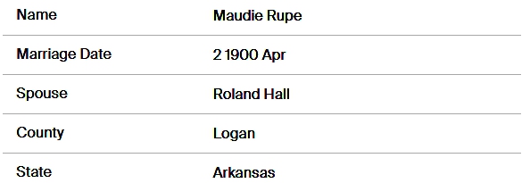 By searching this database I discovered one particular fact about which I had been misled by “family lore” I guess you would say. My great grandparents, Roland Hall and Maude Rupe (William and Mary Ellen’s daughter), were always said to have snuck off to Mena, the county seat of Polk County, Arkansas, ostensibly because Maude was actually a bit young in 1900. Here is the oft-repeated story (which I will now have to correct!):